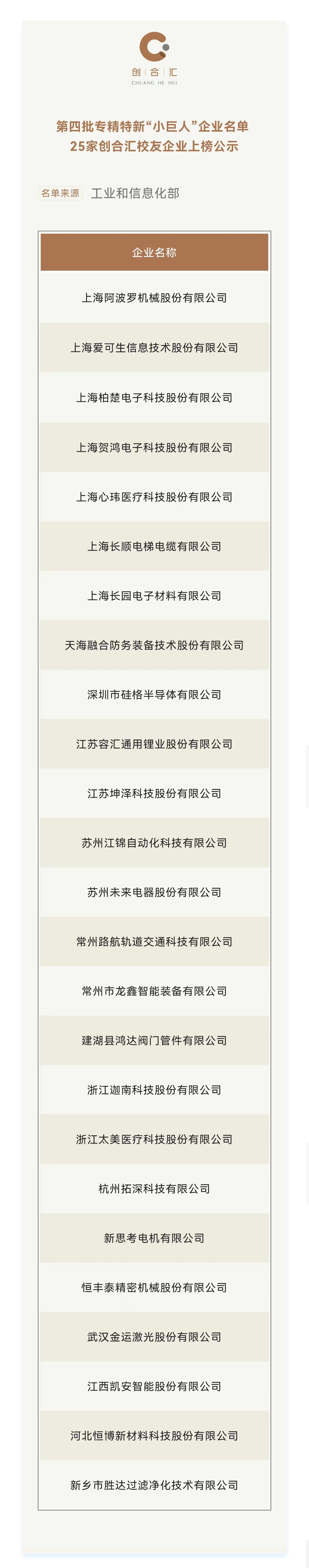 其中,创合汇校友企业共有25家获得 国家级专精特新“小巨人”的认定,并成功入选!名单如下: